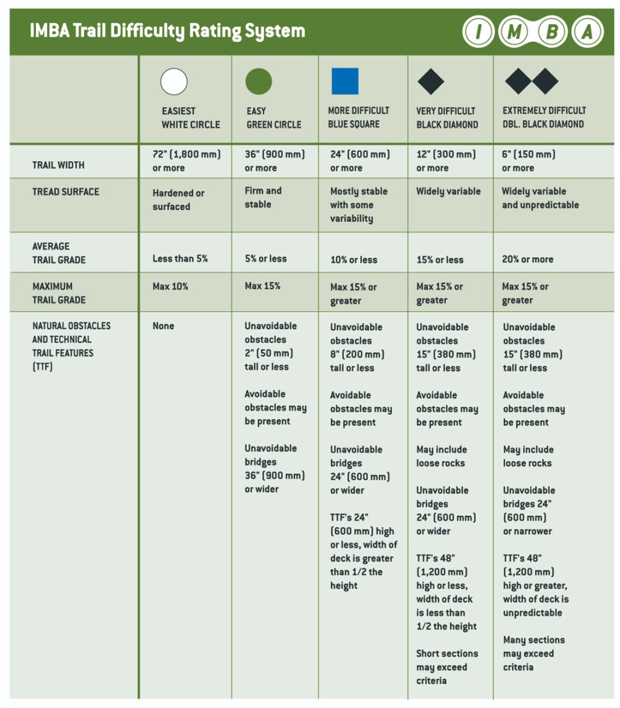 The international mountain bike trail wayfinding symbol — a triangle with two circles underneath — turned out not to be a suitable starting point for adding multiple meanings. However, from my trip to Canada in 2017, I know they use symbols there to indicate different levels.